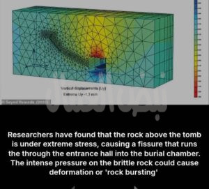 كما اكتشف الباحثون أن الصخور فوق المقبرة تتعرض لضغط شديد، مما تسبب في تكوّن صدع يمتد من قاعة المدخل إلى غرفة الدفن.
