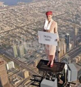 تخيل كده معايا: واحدة لابسة يونيفورم مضيفة طيران، واقفة لوحدها فوق قمة برج خليفة – أعلى برج في العالم – على ارتفاع يوصل لحوالي 828 متر! يعني تقريبًا قد تلات مرات برج إيفل. مفيش حواليها لا شاشات خضراء ولا خدع سينمائية ولا حتى حبال متعلقة باينة في الكادر… هي واقفة كأنها واقفة على الرصيف قدام بيتها!