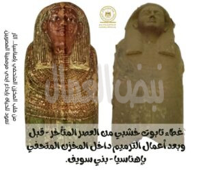 غطاء تابوت خشبي علوي من العصر المتأخر، خضع لأعمال تنظيف ومعالجة دقيقة لإزالة الأتربة والعوالق، وتثبيت الطبقات السطحية الضعيفة واستكمال الأجزاء المفقودة، مما أسهم في استعادة تفاصيل الوجه والعناصر الزخرفية التي كانت مطموسة بفعل الزمن.