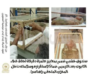 كما تم تجهيز صندوق خاص لحفظ القطعة ونقلها بأمان بعد الانتهاء من أعمال الترميم، بما يضمن الحفاظ عليها وفقًا للمعايير العلمية المعتمدة.