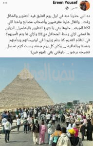 وعبرت الأستاذة / إيرن يوسف علي صفحتها بالفيس بوك قائلة.. دة اللي حذرنا منه في أول يوم اتطبق فيه التطوير والشاتل زفت… واتقال علينا مغرصيين وأصحاب مصالح واحنا اللي اكلنا الجبنة.. حلوها بقي يا بتوع التطوير بالبشاميل… الزباين هاتمشي ازاي وسط الجحافل دي؟؟؟؟؟