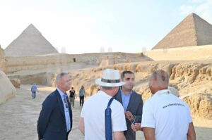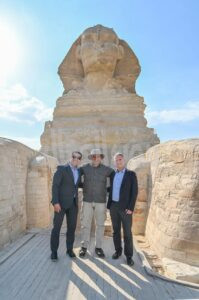 وفي إطار ذلك ظهر السيد أشرف محي مع أثنين من السائحين يأخذ معهم الصور التذكارية أمام أبوالهول بعد الانتهاء من الشرح لهم.