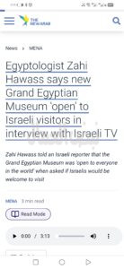 نقلا عن موقع نيو عرب الإخبارية صرح أن عالم المصريات المثير للجدل زاهي حواس أجرى مقابلة مع وسائل الإعلام الرسمية الإسرائيلية وقال إن المتحف المصري الكبير (GEM) “مفتوح لأي شخص” بعد سؤاله عما إذا كان الإسرائيليون موضع ترحيب.