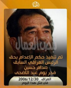 في مثل هذا اليوم من عام 2006 تم تنفيذ حكم الإعدام بحق الرئيس العراقي السابق صدام حسين فجر يوم عيد الأضحى، عقب محاكمته أمام المحكمة الجنائية العراقية العليا. وقد شكّل هذا الحدث محطة مفصلية في تاريخ العراق و المنطقة.